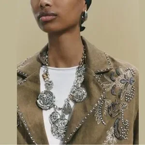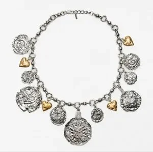 Stunning statement necklace featuring ornate medallion-style coin charms and delicate heart accents. Chain link design with antique-inspired embossed details. Mixed metal combination creates elegant contrast.