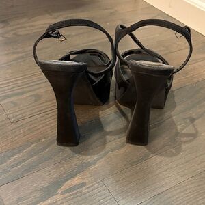 Stylish black heels with crisscross straps. Perfect for any occasion. Vegan-friendly design.