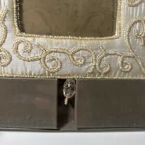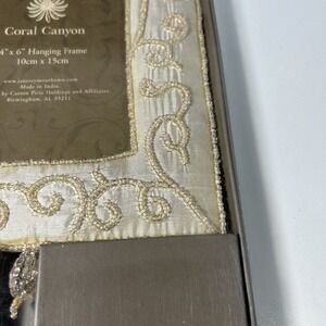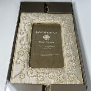 This is a Jane Seymour Coral Canyon 4x6" hanging photo frame made in India. It features an elegant design in orange color with a rectangle shape. The frame is less than 10 inches in length and less than 5 inches in width, perfect for displaying a 4x6" photo. It is not handmade and has not been modified.