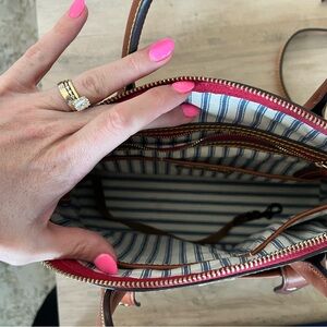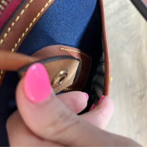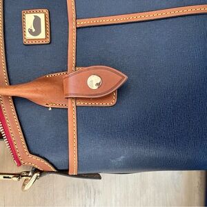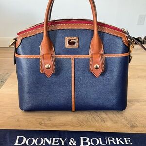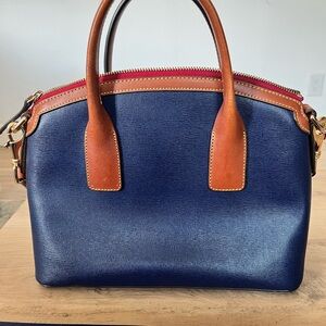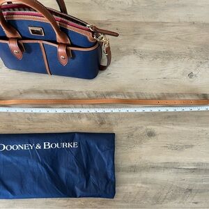 Dooney & Burke navy satchel bag with brown leather trim and straps. Comes with original dust bag. Also included is an extra strap. This bag is like new, used maybe once. Any imperfections are shown. Genuine leather. Measurements pictured.