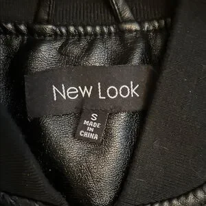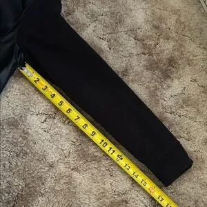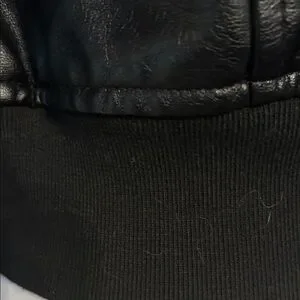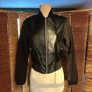 NWOT. A black “pleather” cropped lined jacket, with zipper closure. Two side pockets with snap closure. The arms, collar & waist are warm, snuggly fabric. Back of the jacket has beautiful stitching (see photo #6).