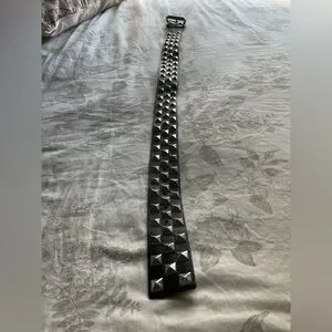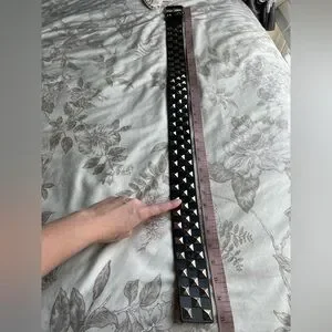 Stylish black belt with silver studs. Perfect for adding edge to any outfit. Love the belt. It is absolutely beautiful, but sadly it is too small for me. Size Small but fits like an XS. Measurements in pics.