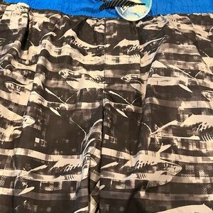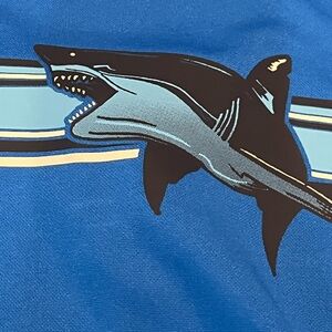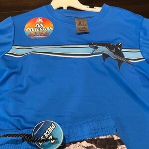 Blue swim set with shark design. Includes a shirt and shorts.