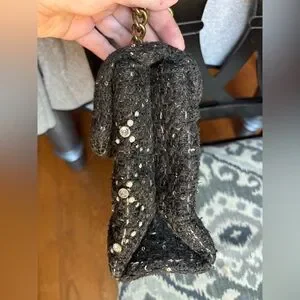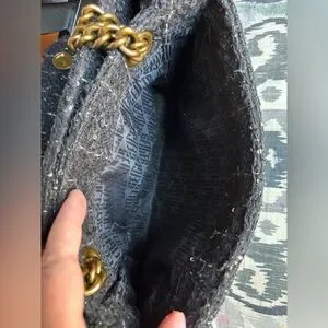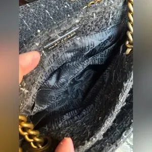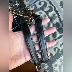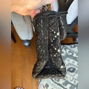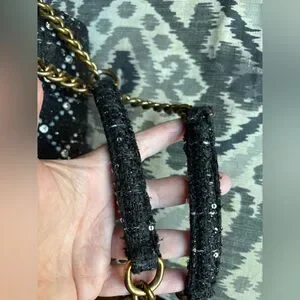 Black tweed type material with fuzzy texture and decorative jewels and pearls (all are intact).