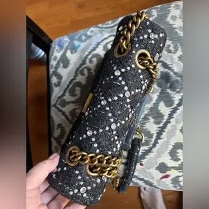 Chain strap with two handles that can be worn single and longer or double and shorter via the holes on the top of the bag that allow you to adjust the strap length. Gold tone hardware.