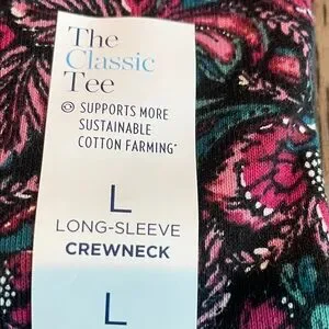 Stylish long-sleeve tee with a vibrant paisley pattern. Features a blend of pink, green, and black hues.