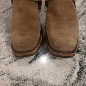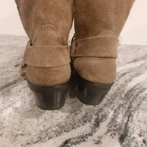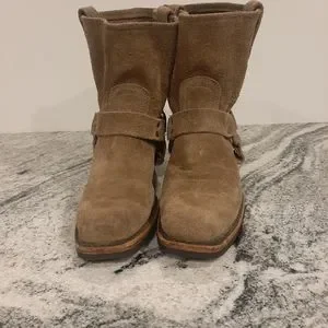 Stylish Frye ankle boots in tan suede. Features a round toe and decorative strap with metal ring. Perfect for casual wear.