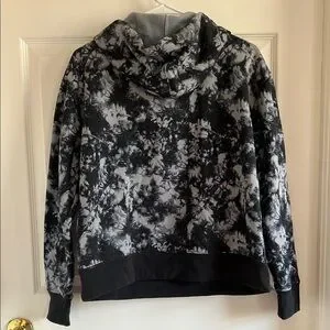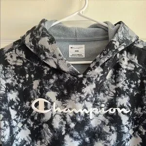 Stylish Champion hoodie with a black and gray tie-dye pattern. Features a front pocket and hood.