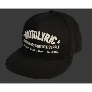 Black Moto Lyric snapback hat embroidered with “Motorsports Culture Supply” and Santa Clarita, California location details. Built on an authentic New Era 9FIFTY structured snapback with flat brim and adjustable plastic closure. Classic motorsports/streetwear look with bold white embroidery.