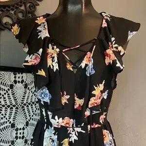 Chic mini dress with colorful floral design. Features ruffled sleeves and lace-up neckline.