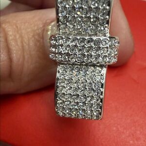 This stunning silver bow ring is encrusted with sparkling stones, perfect for adding a touch of elegance to any outfit.