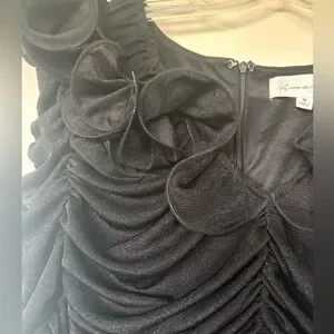 Chic black dress with ruched detailing throughout and 3D flowers at the neck. Long sleeves and elegant design. It’s flattering and versatile style with the stretch and lightweight lined fabric make it the perfect little black dress for the spring and summer. It is both timeless and more of a statement dress. Would be great for night out, cruise, resort vacation and can be dressed more formally or worn casually. It is super comfortable.