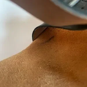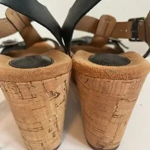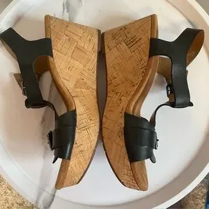 Comfortable Clark’s Artisan cork wedge heels. Black leather with functional buckles.