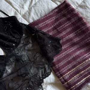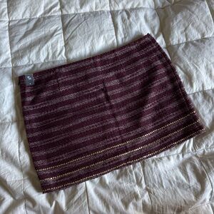 Stunning vintage piece from Abercrombie & Fitch featuring a rich maroon/burgundy tweed-like textured fabric. This skirt is elevated with delicate horizontal metallic threading and a double row of gold sequin detailing along the hem. A perfect blend of preppy and party.