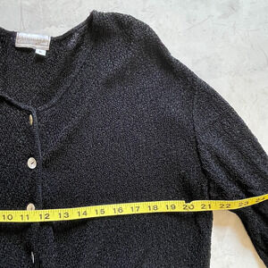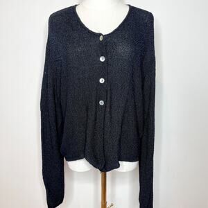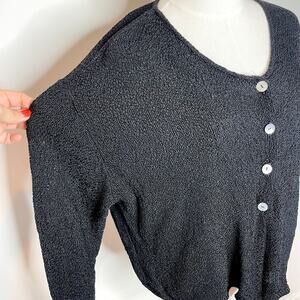 Vintage 90s Coldwater Creek black textured knit cardigan with iridescent shell buttons. Lightweight and airy fabric makes it perfect for layering through spooky season, coastal evenings, or as a witchy dark cottagecore inspired piece. Effortlessly versatile—wear open as a layering piece or buttoned up as a top.