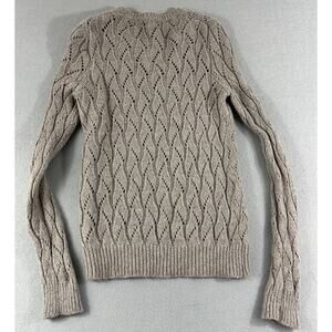 The Ann Taylor Loft Angora Blend Wool Cotton Open Knit Pointelle Sweater in Women's size Medium is a stylish and versatile pullover sweater perfect for various occasions. Made from a blend of wool, cotton, and angora, this sweater is breathable and comfortable for all seasons. The open-knit pointelle pattern adds a touch of texture and the classic crew neck and long sleeves make it a timeless wardrobe staple. The brown color and hipster, designer, and preppy themes give it a chic and sophisticated look, making it a great choice for travel, casual wear, or any other fashion-forward activities.