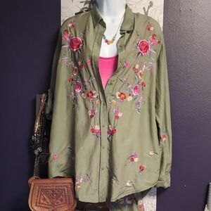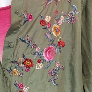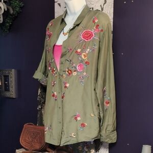 Stylish olive green button down shirt. Features vibrant floral rainbow embroidery.