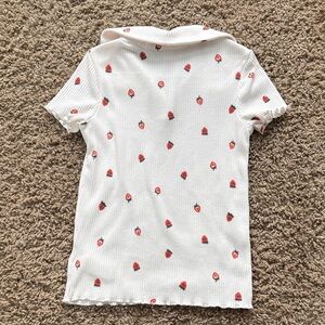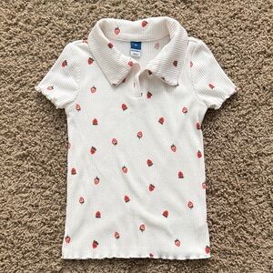 Charming white polo with cute strawberry design. Ideal for everyday wear.