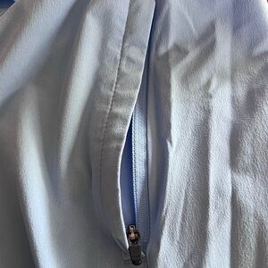 Zippered hip welt pockets.