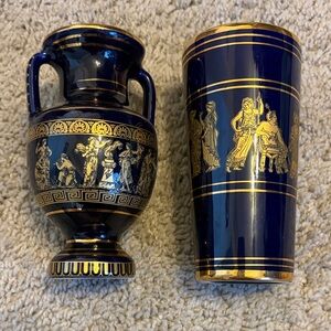 This set includes two vintage Greek decorative vases, meticulously crafted from ceramic with a rich cobalt blue glaze. Each vase is adorned with intricate hand-painted scenes depicting classical Greek mythology and figures, highlighted with real 24K gold trim. One vase features a traditional amphora shape with two handles, while the other is a sleek, cylindrical form. These pieces serve primarily as ornamental items, showcasing traditional Greek artistry and craftsmanship.
