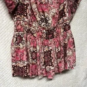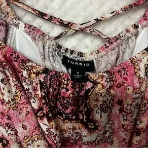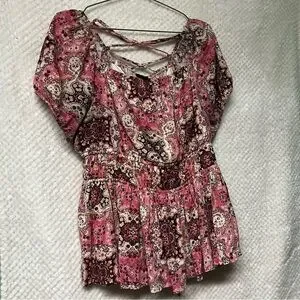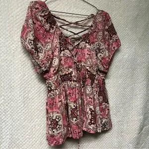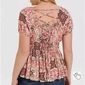 TORRID Crinkle Gauze Cris Cross Back Top Pink & Brown Peplum Cinched Waist Shirt
