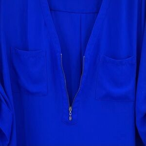 Torrid Harper Vibrant Blue Zipper V-Neck Roll-Tab Sleeve Popover Blouse Top, Women's Plus Size 1X.