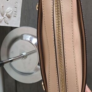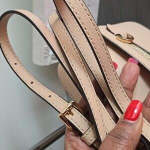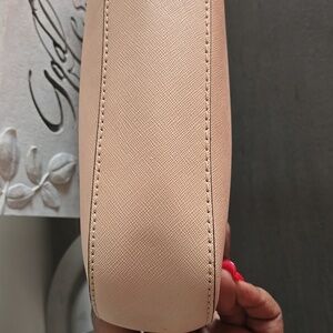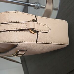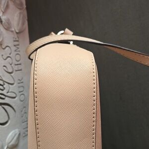 Elegant Michael Kors Jet Set Saffiano leather crossbody bag in cream. Features gold zipper and logo detailing. Perfect for everyday use.
