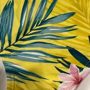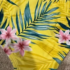 Bright yellow bikini bottom with leaf pattern. Ideal for sunny beach outings. Size XL 16-18. Medium coverage hipster style. New with tags