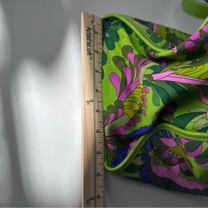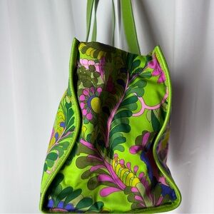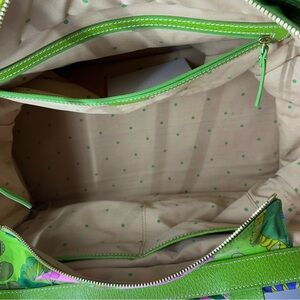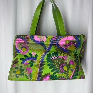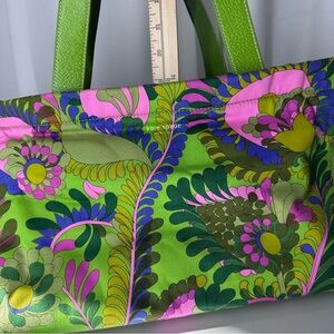This is a standout Kate Spade tote featuring a bold and colorful floral print on canvas with matching green leather trim and handles. Zip-top closure keeps contents secure, and the interior includes a convenient pocket for organization.