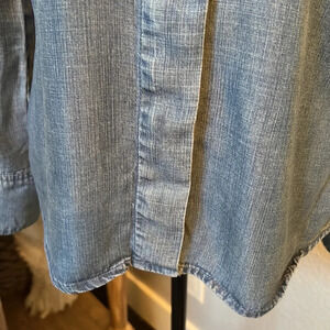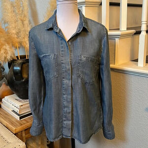 Great looking Bella Dahl lightweight super soft denim button down top. Covered button placket down center front Two patch pockets on each side front bust. Hi lo hem detail with split at center back. Good Used Condition