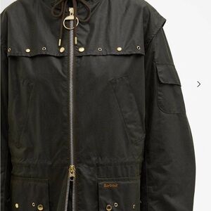 Elevate your outerwear collection with the Barbour Aberford Waxed Jacket. Made from 100% waxed cotton, this Durham-inspired design features a fixed hood, front and back yokes with hardware detailing, and practical hand warmer pockets. Lower patch pockets with hardware accents and a tartan lining add distinctive appeal. For a versatile look, women can style this jacket with slim-fit jeans, a soft knit sweater, and ankle boots for casual days.