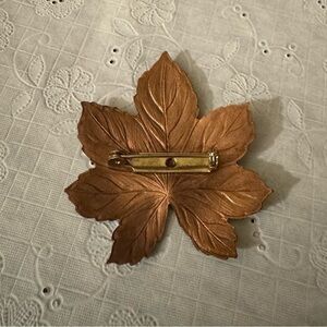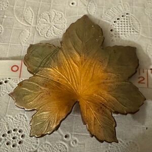 This vintage Leaf Brooch features a delicate leaf shape crafted from enamel and metal. The brooch is designed as a fashion accessory, making it a stylish addition to any outfit. Its timeless design and vintage quality give it a unique charm that will surely elevate your look. Minor scratching on one part of leaf - see pics for details.