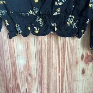 Loft Outlet Navy Blue Smocked Waistband Yellow Floral Print Blouse Size L