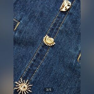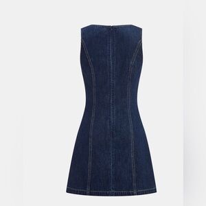 Stylish blue denim mini dress. Features gold button details. Sleeveless and chic.