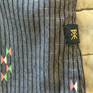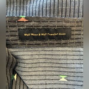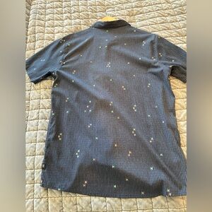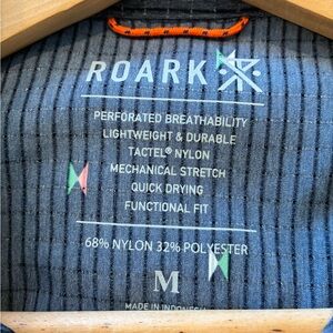 Roark bless up shirt. Perfect condition. Size medium. Navy blue, with small triangles in green, salmon and white. Perforated for cooling. Wrinkles free. Nylon/poly. See pics for measurements. Rubberized buttons.