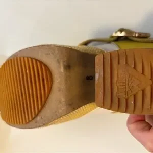 Stylish yellow and white heels with a unique buckle design. These shoes are well broken in, incredibly comfortable and were well loved. You won’t enter a room without complements and comfortable enough for walking and standing for longer periods.