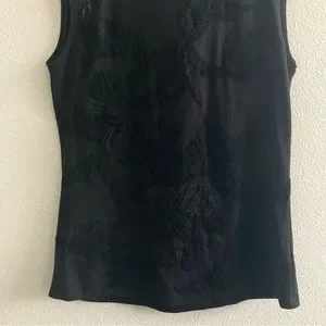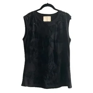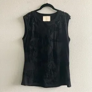 Black sleeveless top with artsy details throughout - beading on shoulders, floral embroidery and sheer mesh/lace. In great condition