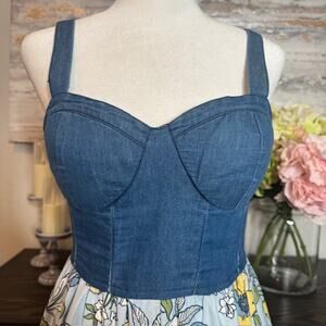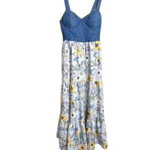 Sweet and feminine Band of Gypsies maxi dress featuring a structured denim bustier-style bodice paired with a flowy floral tiered skirt. The sweetheart neckline and seamed cups give a flattering, corset-inspired look, while the elastic smocked back allows for a comfortable, flexible fit. Finished with a soft blue base and yellow floral print for perfect spring/summer vibes.