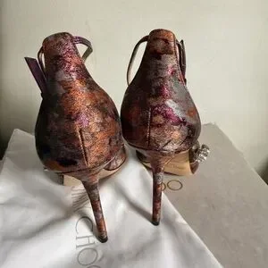 Elegant heels with a striking purple and orange pattern. Features sparkling embellishments and a sleek design.
