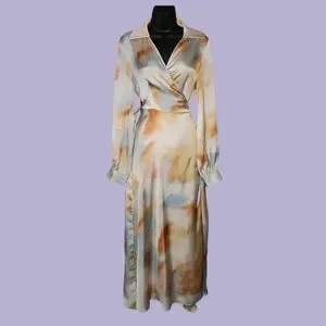 Stylish wrap dress with a tie-dye pattern. Features long sleeves and a flattering fit.