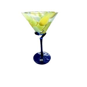 Elevate your glassware collection with this striking hand-blown Romanian art glass martini glass. Featuring a vivid lemon-yellow and white mottled bowl with a cobalt blue swirl detail at the stem, this piece is equal parts sculptural and functional. Its vibrant, eye-catching design adds a playful yet elegant touch to your bar cart, kitchen decor, or cocktail hour setup. Whether displayed on a shelf or used to serve your favorite drinks, this one-of-a-kind piece brings artisan craftsmanship and color into your space.