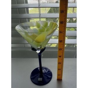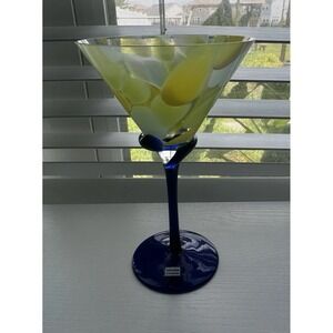 Hand Made In Romania Art Glass Martini Glass 7.5" Yellow Blue Swirl Stem
