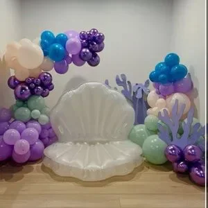 Elegant white inflatable shell chair. Perfect for mermaid or sea-themed birthday decorations