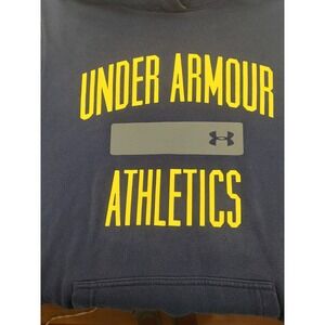 Under Armour ColdGear Storm hoodie provides exceptional warmth and weather resistance for active use. Navy blue fleece body is accented with bold yellow "Under Armour Athletics" graphics and a matching yellow mesh hood lining. Features a classic kangaroo pocket and ribbed cuffs with the Storm logo embroidery on the sleeve. This loose-fit sweatshirt is constructed from a durable cotton-polyester blend designed for comfort and performance in cooler temperatures.