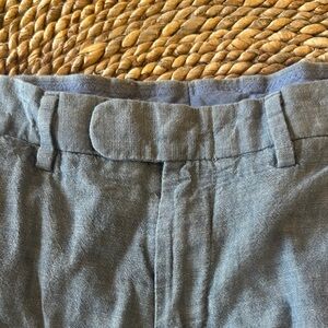 Has pockets on each side of the front with a mini change pocket on one side. Has button pockets on each side in the back as well. Color is a grayish blue. Almost looks like denim. Excellent condition.