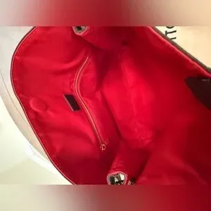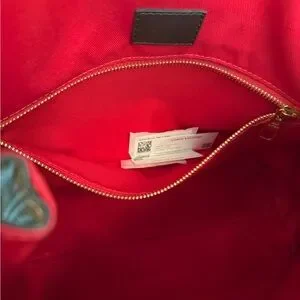 The interior opens to a spacious red textile lining with a zippered pocket for securing essentials like your phone, wallet, keys, and cosmetics. A magnetic closure keeps items easily accessible while maintaining a sleek profile.