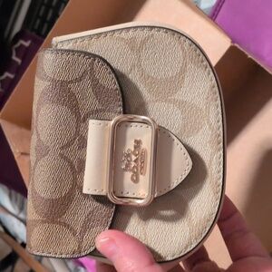 .Chic Coach mini bag with tan and brown tones. Features a sleek design and gold accent. Ideal for versatile styling.