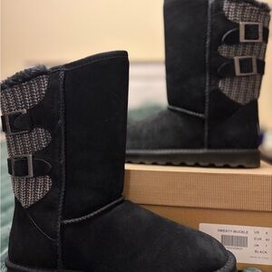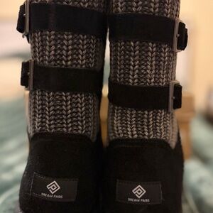 Stay warm and stylish with these black winter boots featuring a cozy knit design. Perfect for cold weather adventures.