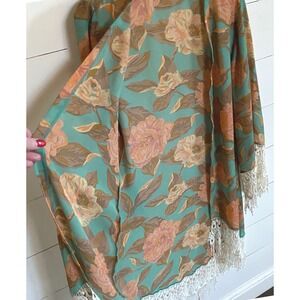 Show Me Your Mumu Floral Kimono Duster Turquoise Coral Lace Fringe Medium