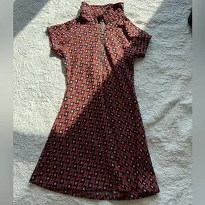 Chic mini dress with a bold geometric design. Features a vibrant red and blue pattern and a quarter zipper. Ideal for casual outings. Worn once
